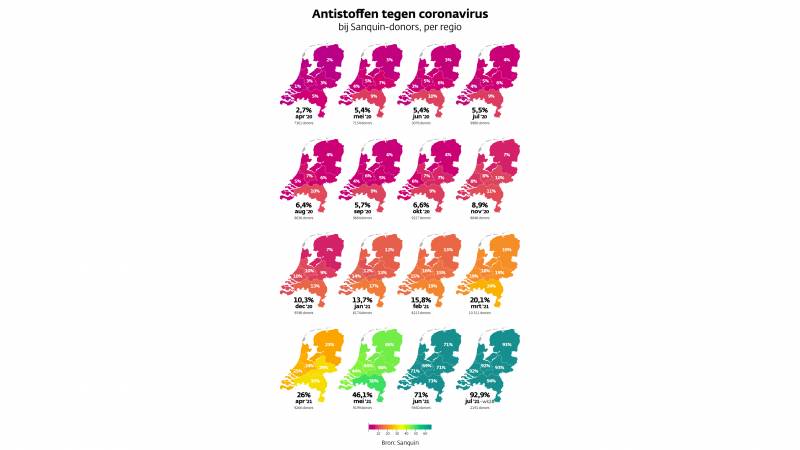 Hieronder zie je toename van antistoffen per regio sinds het begin van de pandemie. Klik op het plaatje om in te zoomen.