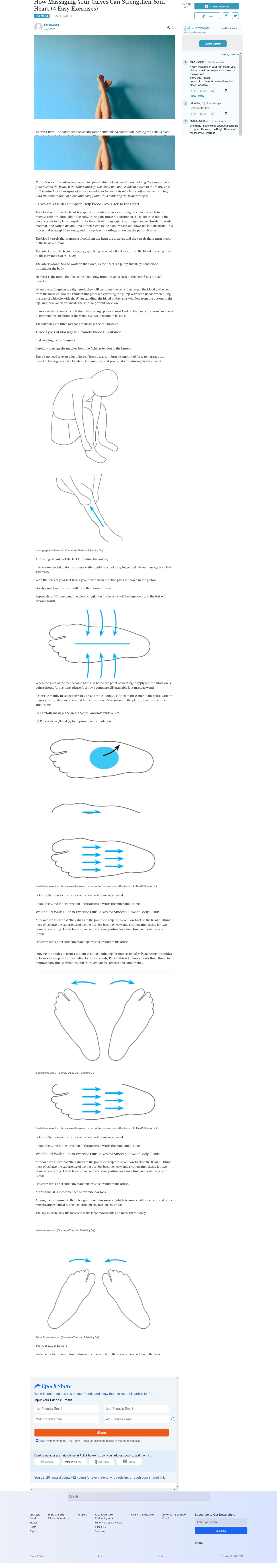 Editor’s note: The calves are the driving force behind blood circulation, helping the venous blood flow back to the heart. If the calves are stiff, the blood will not be able to return to the heart. This article introduces four types of massage and exercise methods which use calf movements to help with the smooth flow of blood and body fluids, thus rendering the heart stronger.